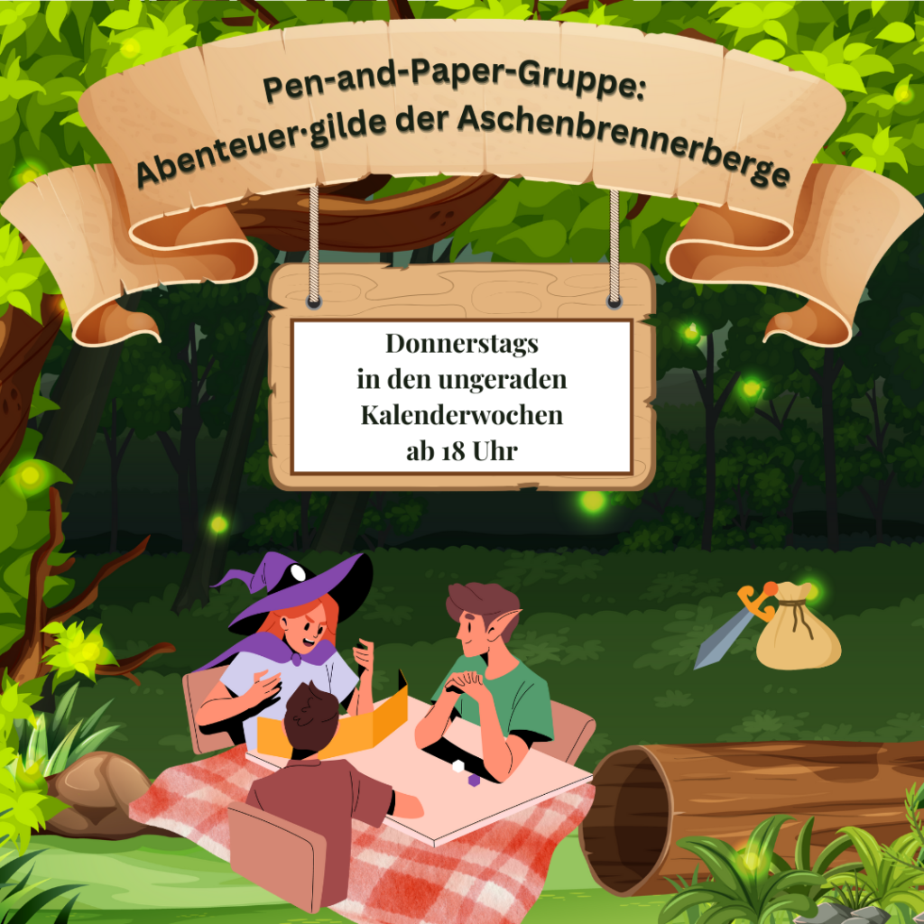 Wir tauchen als Rollenspieler in die Geschichte der Aschebrennerberge ein: Einer grimmen Welt in der eine Gruppe Abenteurer*innen versucht ihren Weg zu finden. Wölfe, Troll*innen, Nekromant*innen und ein matriachales, rassistisches Königreich der Dunkelelfen als Nachbarn. Viele Hindernisse und Herausforderungen erwarten die Spieler*innen, die versuchen ihre Gilde aufzubauen. Doch wenn die Gruppe zusammenhält und sich gegenseitig unterstützt, können sie diese auch überwinden.